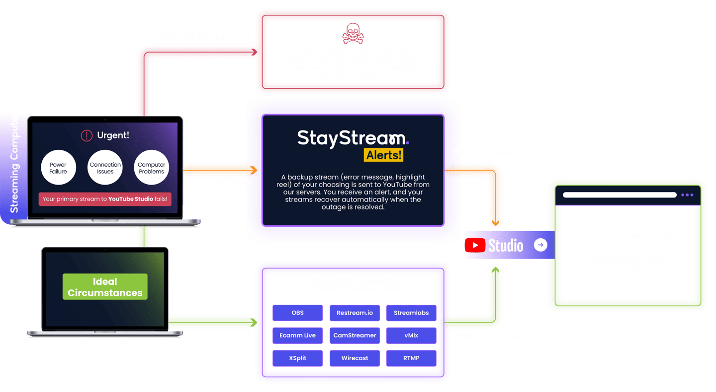 StayStream ensures your YouTube livestreams remain online seamlessly, even during outages. Enjoy uninterrupted streaming with automatic recovery for a lasting URL.